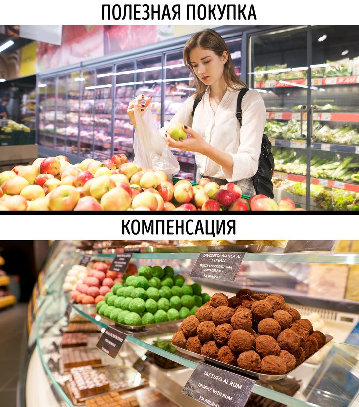 Souvent, à l’entrée des supermarchés, l’acheteur rencontre des aliments sains: légumes, fruits et produits laitiers. Cela n'a pas été fait par hasard: plus une personne dépense d'argent, plus le «droit» perçu de s'acheter quelque chose de délicieux, mais pas très sain, est fort. Il s'agit d'une stratégie de compensation, définie comme une "récompense" avec laquelle une personne est récompensée pour avoir fait le bon choix. Et par conséquent, les aliments les moins sains peuvent consommer une partie importante de notre budget mensuel.