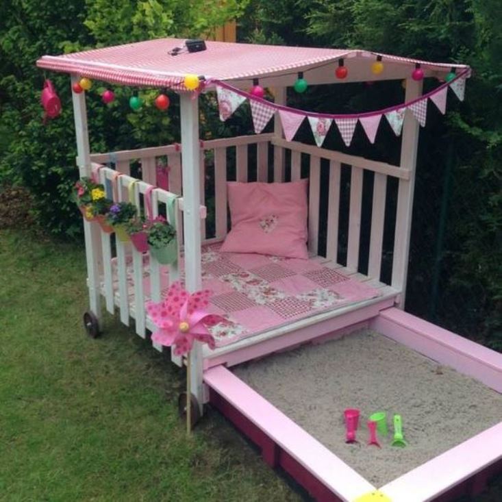 Un joli chalet pour jouer dans la cour sortira également de l'ancien berceau. Vous pouvez fixer un toit à l’ancien berceau et le décorer à votre guise. Par exemple, utilisez une guirlande avec des lanternes, des drapeaux et des pots de fleurs colorés. Vous pouvez également construire un bac à sable à côté de la maison pour que votre enfant puisse y jouer.