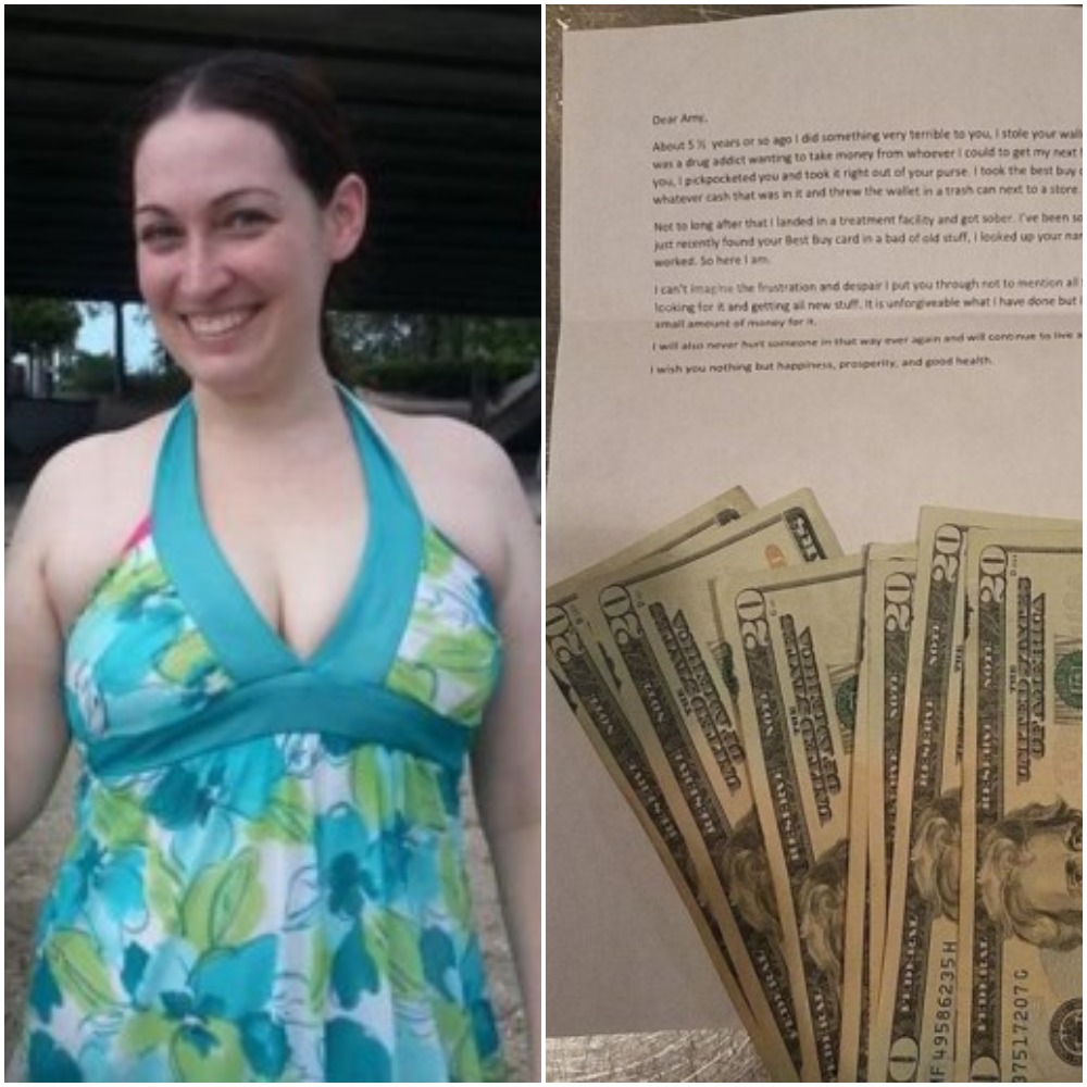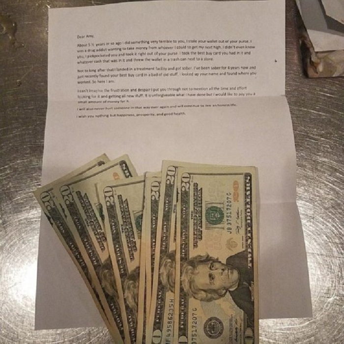 La lettre a été envoyée par nul autre que le voleur qui a volé le portefeuille d'Amy il y a cinq ans. L’homme se repentit du vol et s’excusa sincèrement auprès de sa victime. Il s’avère qu’à cette époque il était toxicomane. Il était constamment à la recherche d'argent et volait plus d'une fois pour acheter la prochaine dose de drogue. Amy était la victime ce soir-là. L'homme a simplement sorti un sac de son sac, a pris l'argent et les cartes et le portefeuille a été jeté à la poubelle.