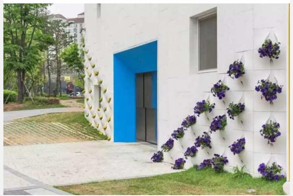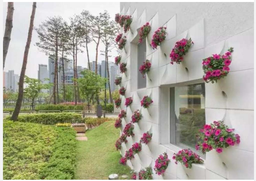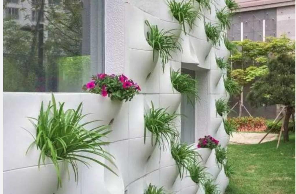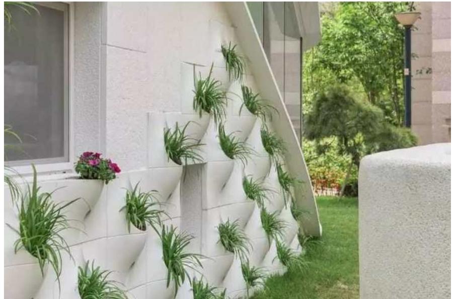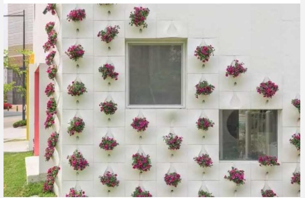 En fait, l'auteur a appliqué le concept assez répandu de plates-bandes verticales, qui sont formées à partir de poches destinées à la plantation de plantes. Une autre chose est que dans la forme traditionnelle, de tels lits sont faits de tissus spéciaux et décorent les murs du jardin comme une solution décorative complète. Dans ce cas, l'auteur a associé la façade à la fonction décorative d'un lit vertical.