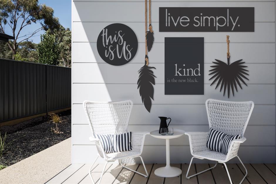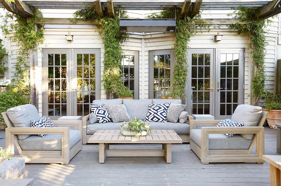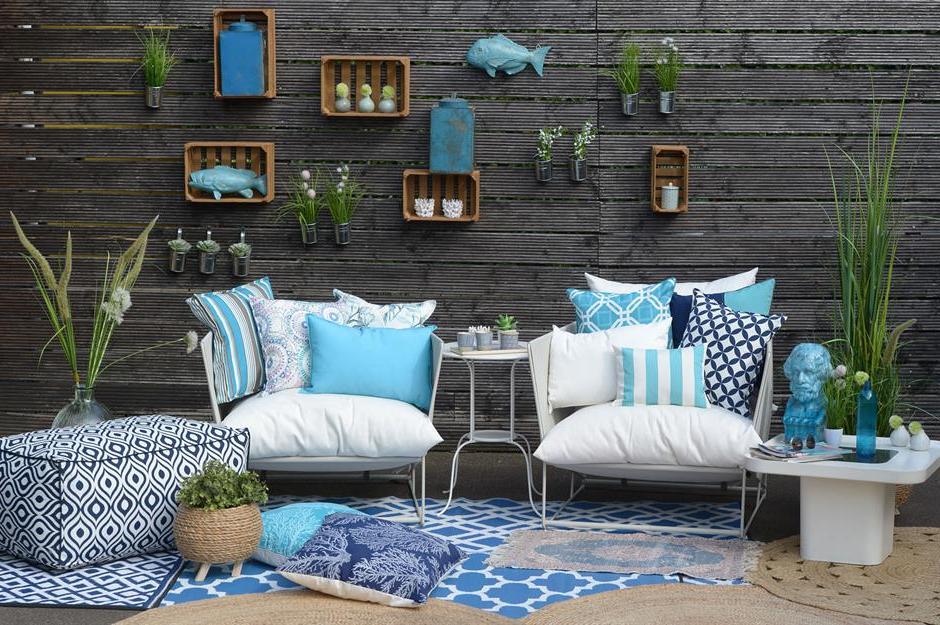 Décorez le patio gris avec beaucoup de détails de couleurs. Drapez le sol en béton disgracieux avec des tapis qui complètent l'intérieur de style océan.