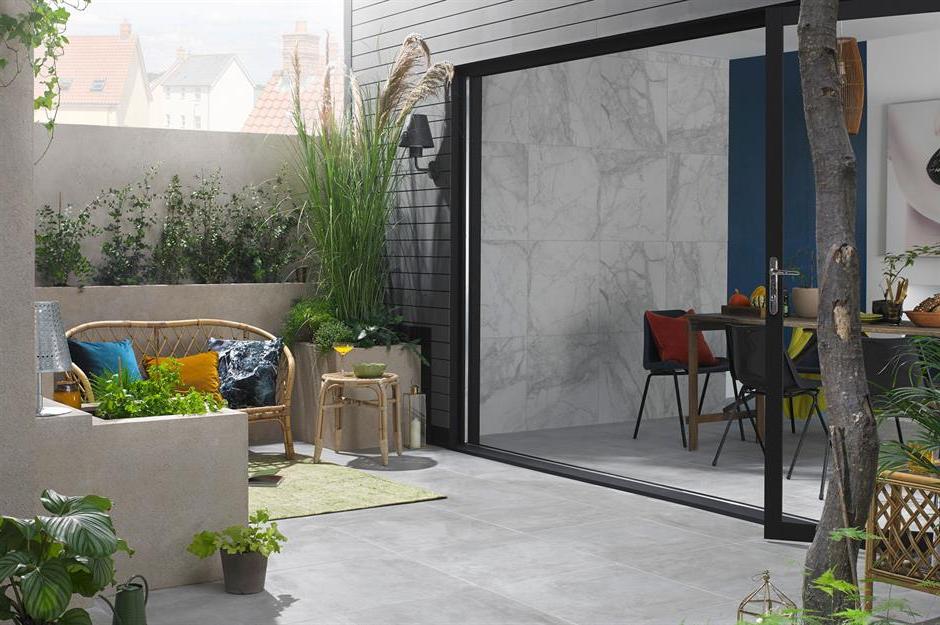 Ces portes en verre blanc, encadrées de guirlandes de verdure, ont un aspect si décoratif qu’il ne reste plus qu’à placer devant elles des meubles en bois naturel avec des coussins de couleurs pastel.
