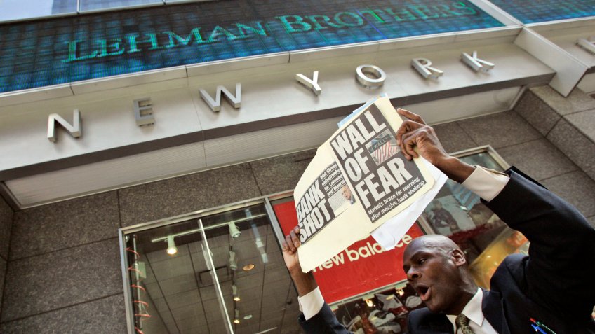 Dans l'image un peu plus haut, nous voyons des employés d'une banque d'investissement en faillite.