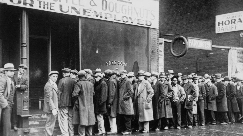 L’effondrement de Wall Street est entré dans l’histoire comme le début de la Grande Dépression dans l’histoire des États-Unis. Une chute brutale du cours des actions a eu lieu le 24 octobre. Les gens ont perdu leur argent, qu'ils ont économisé pendant de nombreuses années. Ce jour est devenu connu comme le jeudi noir. Et cela a été suivi par Black Friday, etc. Sur la photo, un peu plus haut est la file vers la salle à manger Al Capone pour la distribution gratuite de soupe.
