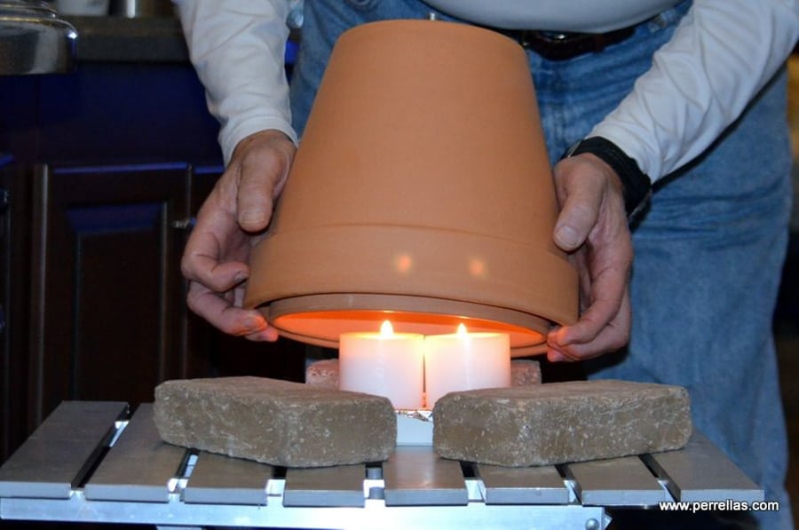 Ceci termine le processus de création d'un appareil de chauffage. Pour qu’il commence à chauffer la pièce, le «foyer domestique» doit être retourné et 3 à 4 bougies à thé posées sur une palette. La chaleur commencera à se répandre dans 40 à 50 minutes.