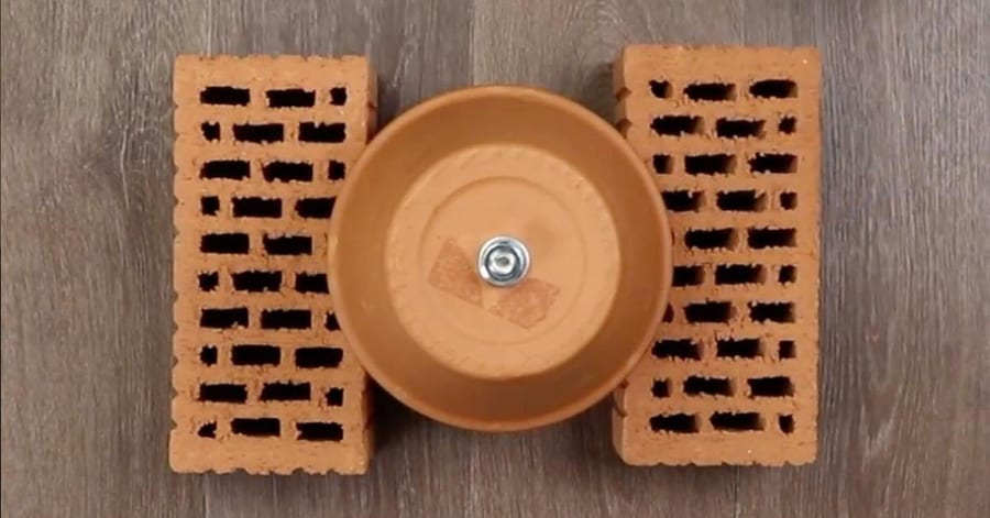 Au centre de la casserole, percez un trou et insérez la tige en la fixant des deux côtés avec des écrous et des rondelles. Ensuite, les pots sont fixés de la même manière (il y a déjà des trous) de sorte qu’entre le bord du pot et la palette, et aussi entre les pots eux-mêmes, il doit y avoir 4 cm.