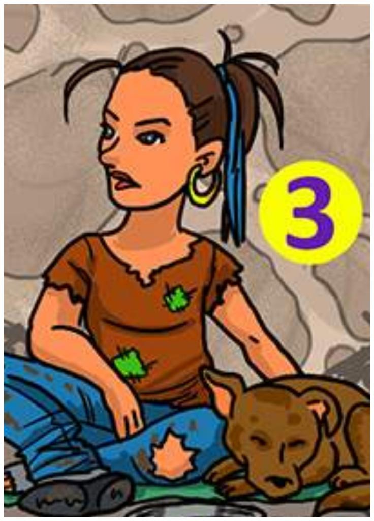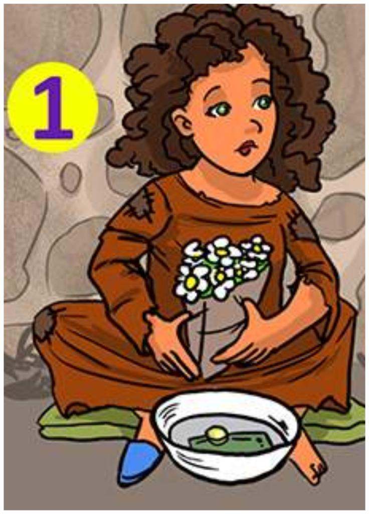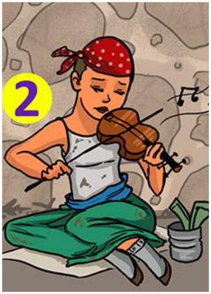 Un mendiant essaie de vendre des fleurs, le second joue d'un instrument de musique. Le troisième, selon toute probabilité, essaie de gagner de l'argent pour nourrir son chien.