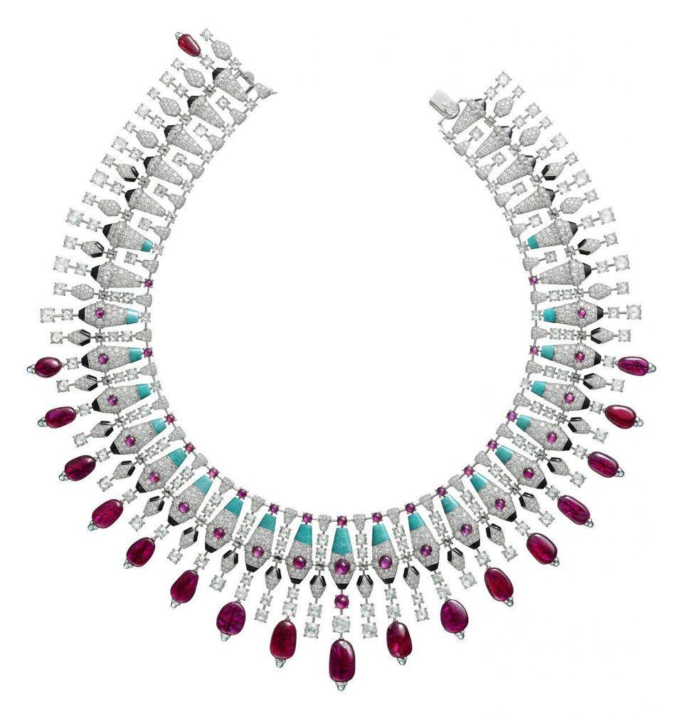 Un collier de bijoux haute Cartier Magnitude avec des perles de rubis du Mozambique incarne cette approche; il utilise plus de 107 carats de perles de rubis du Mozambique mélangées à des tourmalines à l'aquarelle, des amazonites turquoises, de l'onyx et des diamants. Certains d'entre eux ont des qualités géométriques ressemblant à des décorations art déco.