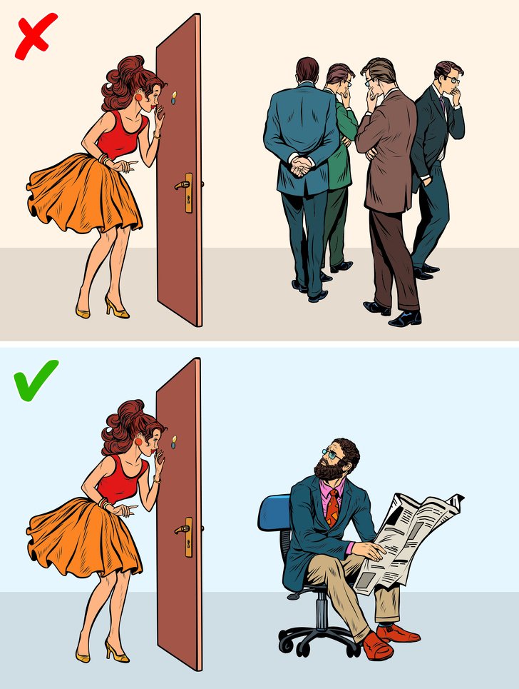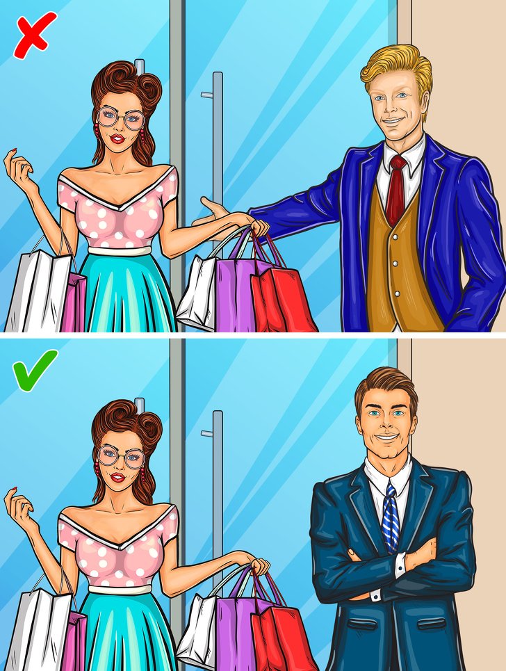 Un vrai gentleman conduit toujours une femme et l'aide avec des sacs lourds, mais ne vous le permettez pas sur le lieu de travail. Entrez et entrez le premier sans ouvrir la porte à qui que ce soit. La même chose s'applique aux filles portant des manteaux. Sur le lieu de travail, les femmes n’ont pas besoin d’aide ni de gestes courtois de la part d’un homme et peuvent même prendre cela pour une insulte.