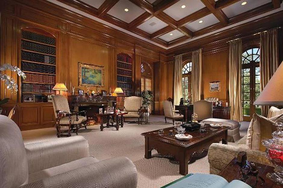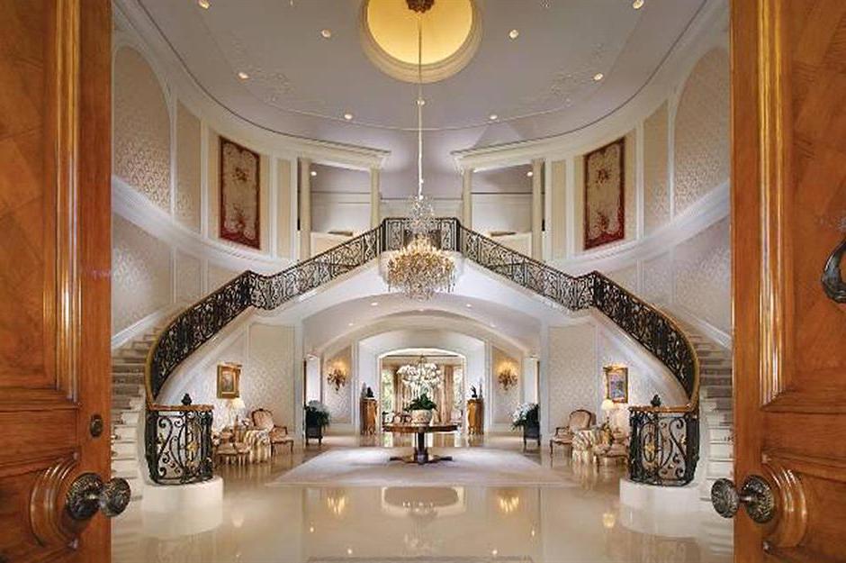 Dehors, une longue route sinueuse mène à une cour circulaire, à une fontaine et à une place pour 100 voitures. La maison est tout simplement immense et son territoire ressemble à une petite ville.