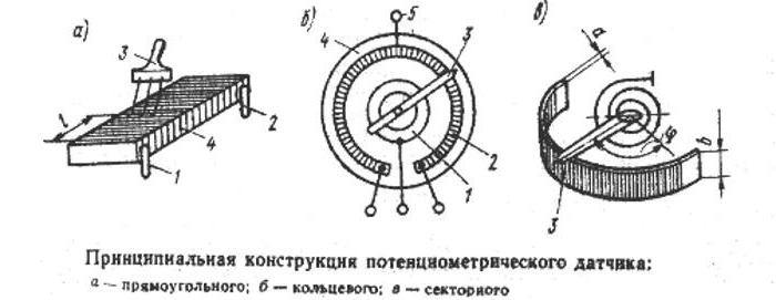Le capteur de déplacement linéaire potentiométrique consiste en un cadre diélectrique de différentes formes (plaques, cylindres, bagues, etc.) sur lequel un fil isolé est enroulé, fixé aux pinces et fixé à l'aide de pinces aux extrémités. Une brosse métallique se déplace le long du bobinage. Pour les capteurs de type rotatif, les cadres sont annulaires, longitudinaux - droits. Aux endroits de contact avec le moteur, il n'y a pas d'isolation sur le fil.