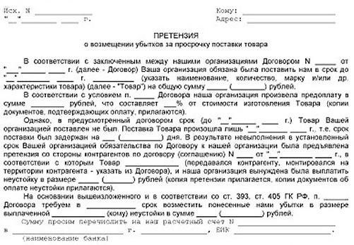 Le motif de la plainte est une violation des termes de l'accord. Que ce soit important ou non, peu importe. Le document se concentre sur une exigence ou plusieurs à la fois. L'option de formulation est sélectionnée par l'expéditeur. S'il y a des nombres, alors le texte doit nécessairement inclure des calculs qui les justifient.