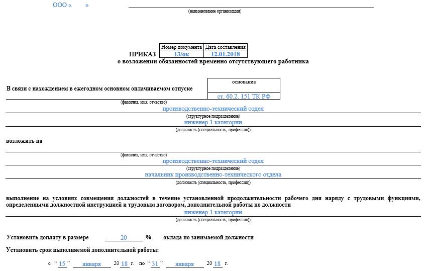 Lorsqu'un spécialiste part en vacances, il est souvent nécessaire de le remplacer par un autre employé de l'entreprise. Le processus doit être effectué uniquement avec la documentation appropriée. Pour ce faire, une commande est nécessairement émise et un nouveau calcul est également effectué, le député étant obligé de recevoir un bon bonus pour son travail.