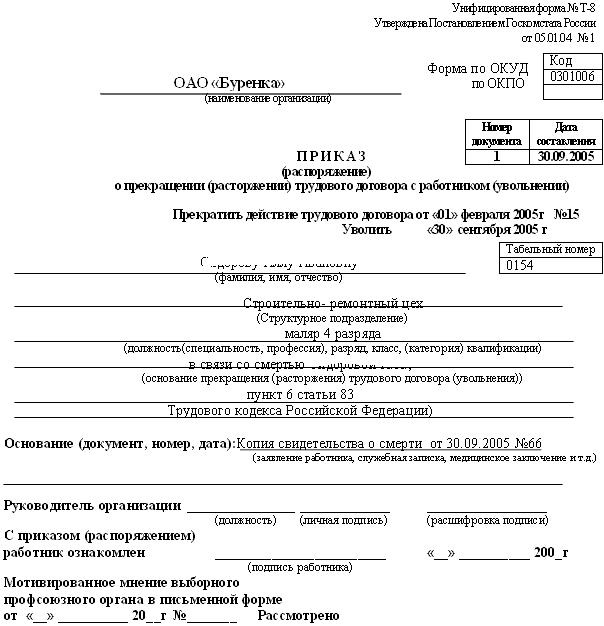 La situation est désagréable, mais on peut la rencontrer dans n'importe quelle entreprise. L’exécution de la commande lors de la résiliation du contrat de travail ne diffère pas dans les circonstances habituelles. La différence consistera uniquement à fixer la date de licenciement - elle est extraite du certificat de décès. Sans ce formulaire, l'organisation n'a pas le droit de licencier un employé pour cette raison. Et selon la loi, les paiements prescrits ne sont naturellement pas perçus par le salarié lui-même, mais par ses proches.