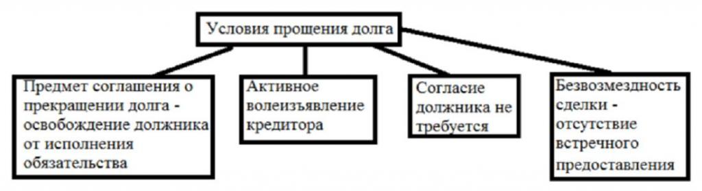 La loi stipule que l'annulation de la dette, comme toute autre forme de don, peut être effectuée exclusivement et sans frais. Le porteur de la dette n'acquiert aucun avantage matériel, le débiteur n'est soumis à aucune obligation. Toutefois, le contrat d’annulation de la dette prive le créancier de toute possibilité de présenter des créances au débiteur afin de lui permettre de s’acquitter des obligations initiales établies par le contrat, y compris en le demandant devant un tribunal. Une exception peut être considérée comme l’adoption d’un tel accord nul pendant dix ans à compter de la date de signature.