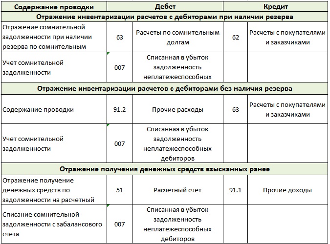 Et seulement lorsque, selon la comptabilité, les créances irrécouvrables ne peuvent pas être couvertes par des dettes fournisseurs, cela est attribué aux pertes. Cette action est nécessaire pour éviter des risques fiscaux inutiles. Si la société ne dispose pas de réserve financière pour créances douteuses, la dette est transférée sur le compte "Autres dépenses".