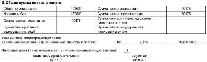 Ici, les revenus totaux sont calculés pour la période pour laquelle le certificat est fourni, l'assiette fiscale est attribuée et l'impôt sur le revenu des personnes physiques est calculé.