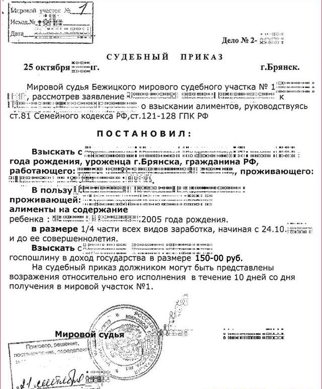 Une ordonnance est une décision de justice rendue sous une forme simplifiée, sans appel des parties. La base est la déclaration de la mère de l'enfant. La demande établie selon le modèle est accompagnée de documents confirmant le fait de paternité et le paiement du droit de l’État.