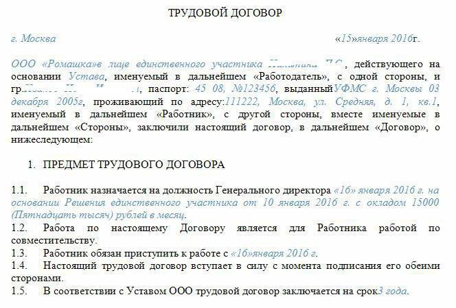 Ce qui précède est un contrat de travail avec un directeur à temps partiel - un exemple de document lorsqu’il est placé dans une LLC.