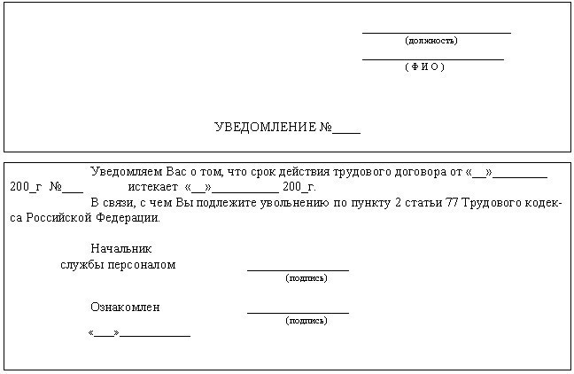 Étant donné que seul le responsable de l'organisation peut décider de mettre fin au travail avec un conscrit, alors seul lui-même ou une personne autorisée peut notifier la résiliation d'un contrat de travail à durée déterminée.