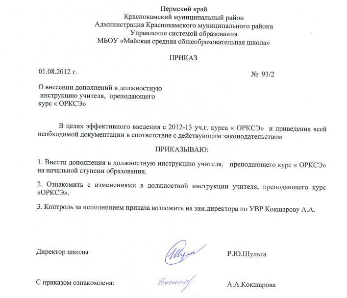 Lors de l’ajustement de documents importants concernant les employés de l’entreprise, il est obligatoire de donner un ordre à l’employeur. Un exemple d'ordre pour modifier la description de travail est présenté ci-dessous.