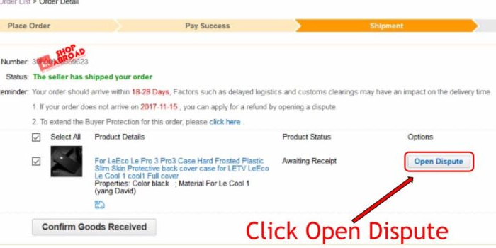 L’ouverture d’un litige sera possible six jours après l’envoi des produits au consommateur. Le litige peut être motivé par le dépassement du délai de livraison ou par la divergence de l'article acheté par rapport à la description publiée sur le site, par la réception de la marchandise présentant des anomalies. De nombreux acheteurs préfèrent contacter le fournisseur avant de contacter l'administration du site ou le service d'assistance Aliexpress. Habituellement, un vendeur qui apprécie sa réputation entre en contact rapidement.